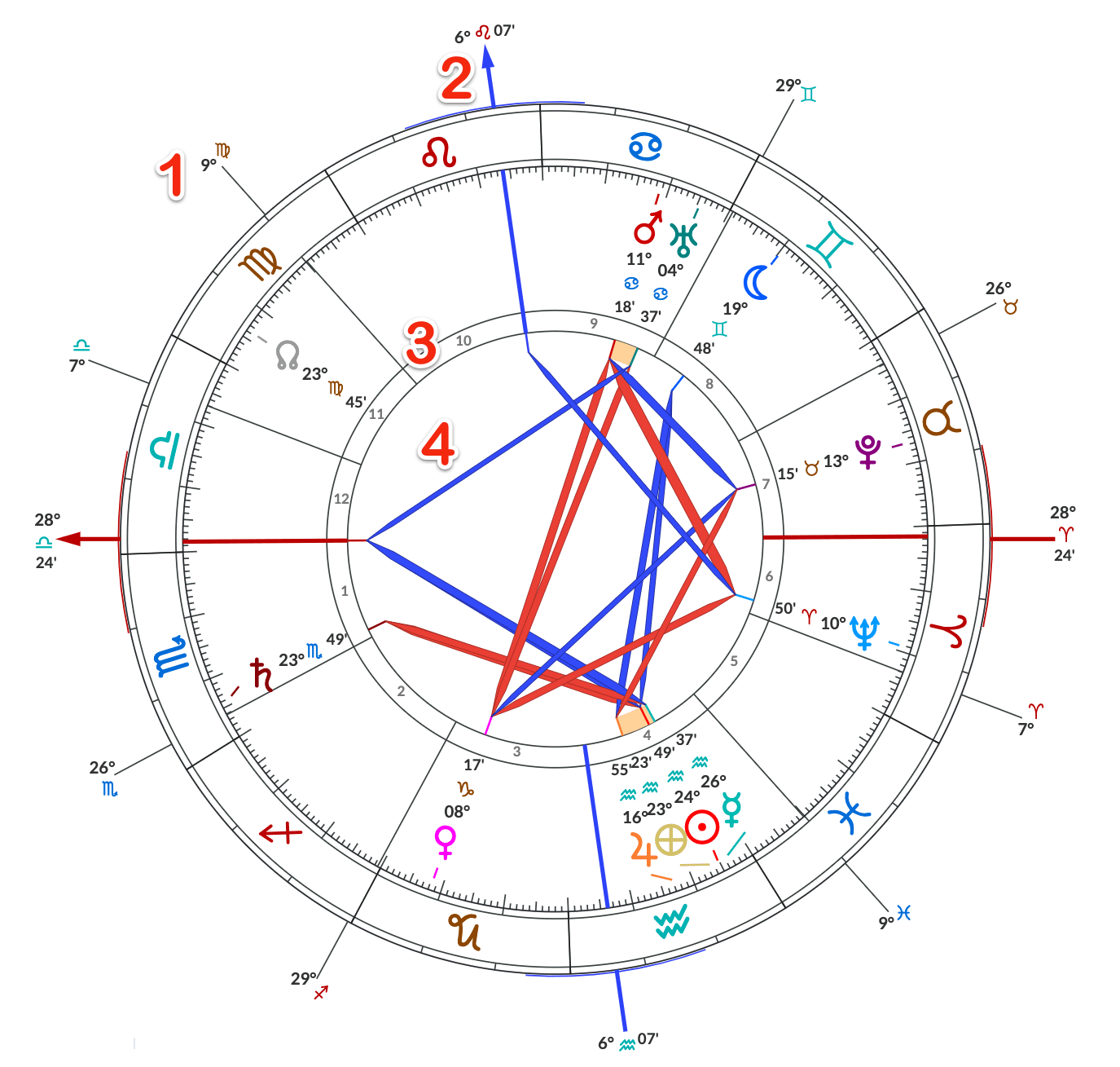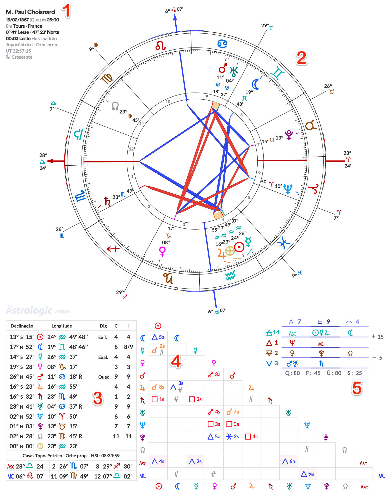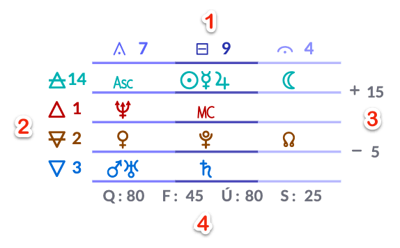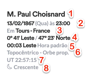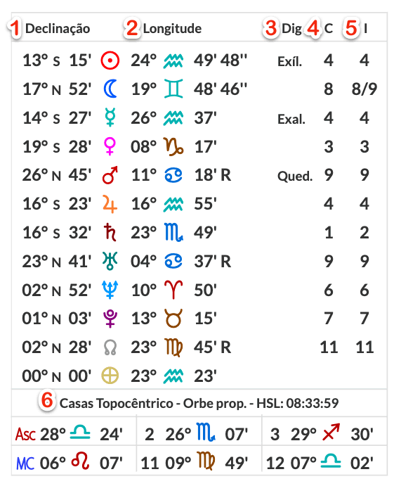 - Grau de longitude das pontas das casas e o signo, nas casas angulares também incluem o minuto.