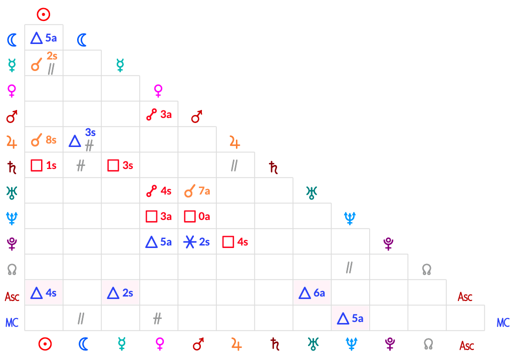 Os aspectos são exibidos no cruzamento entre as linhas e colunas dos pontos/planetas e incluem: