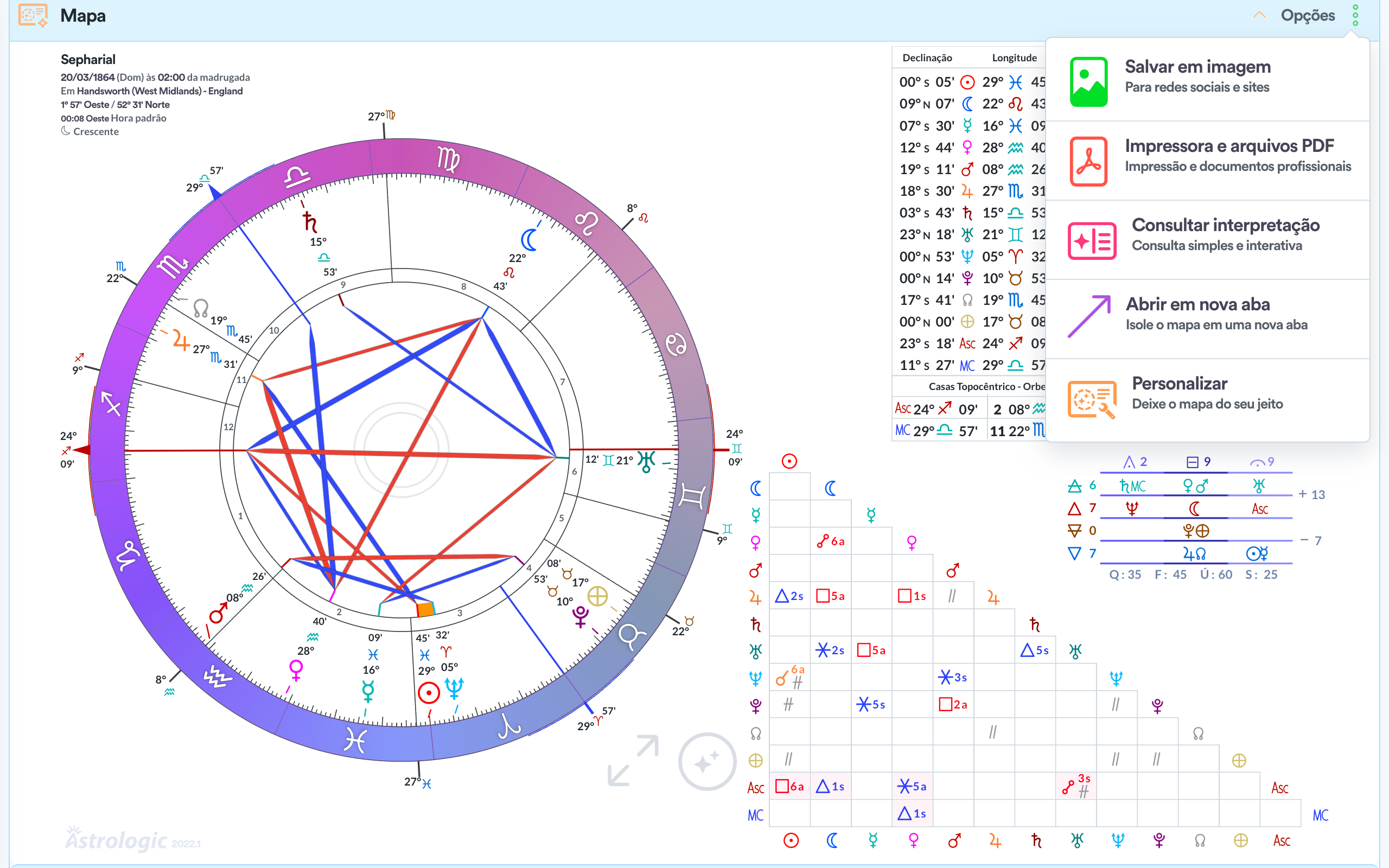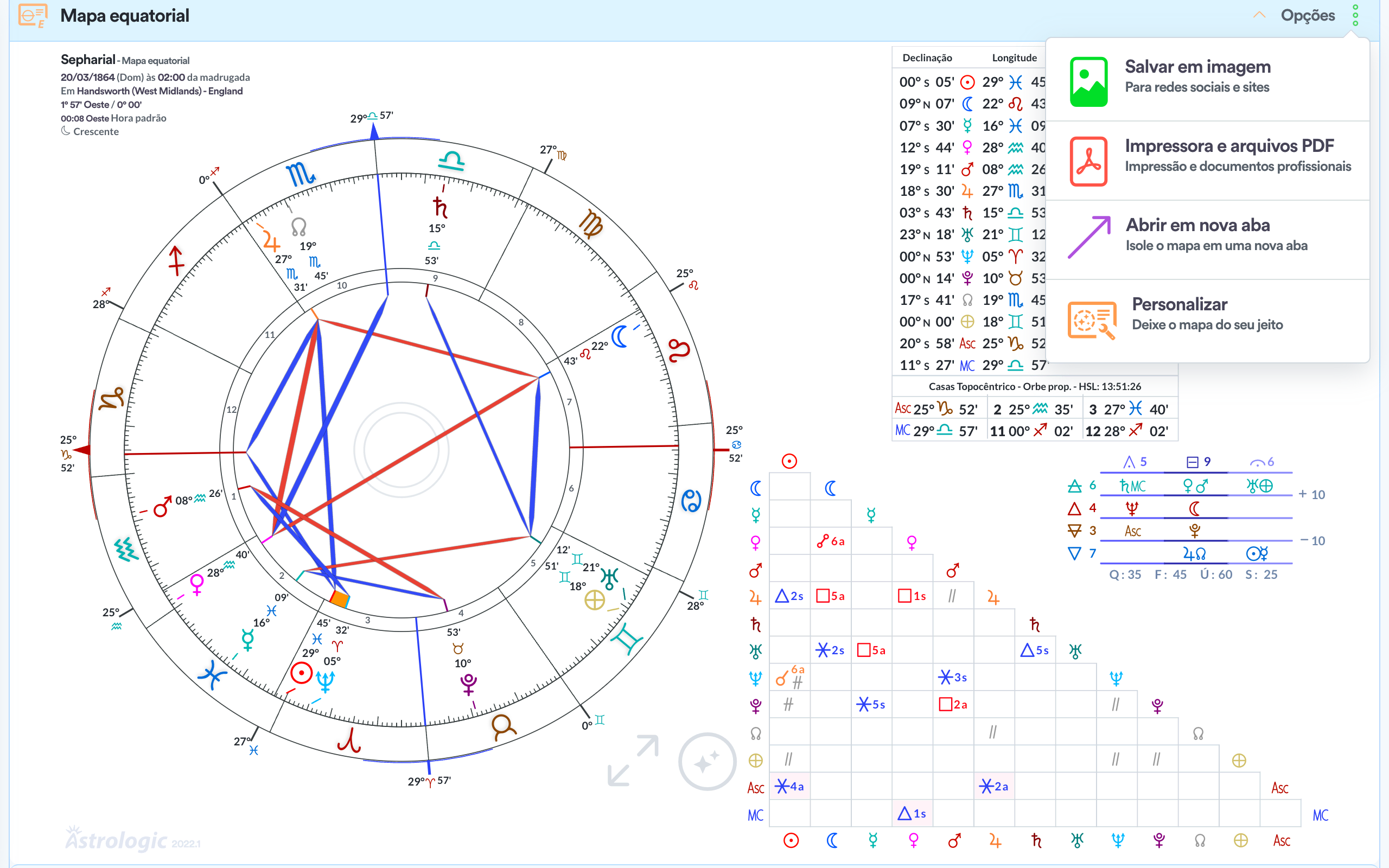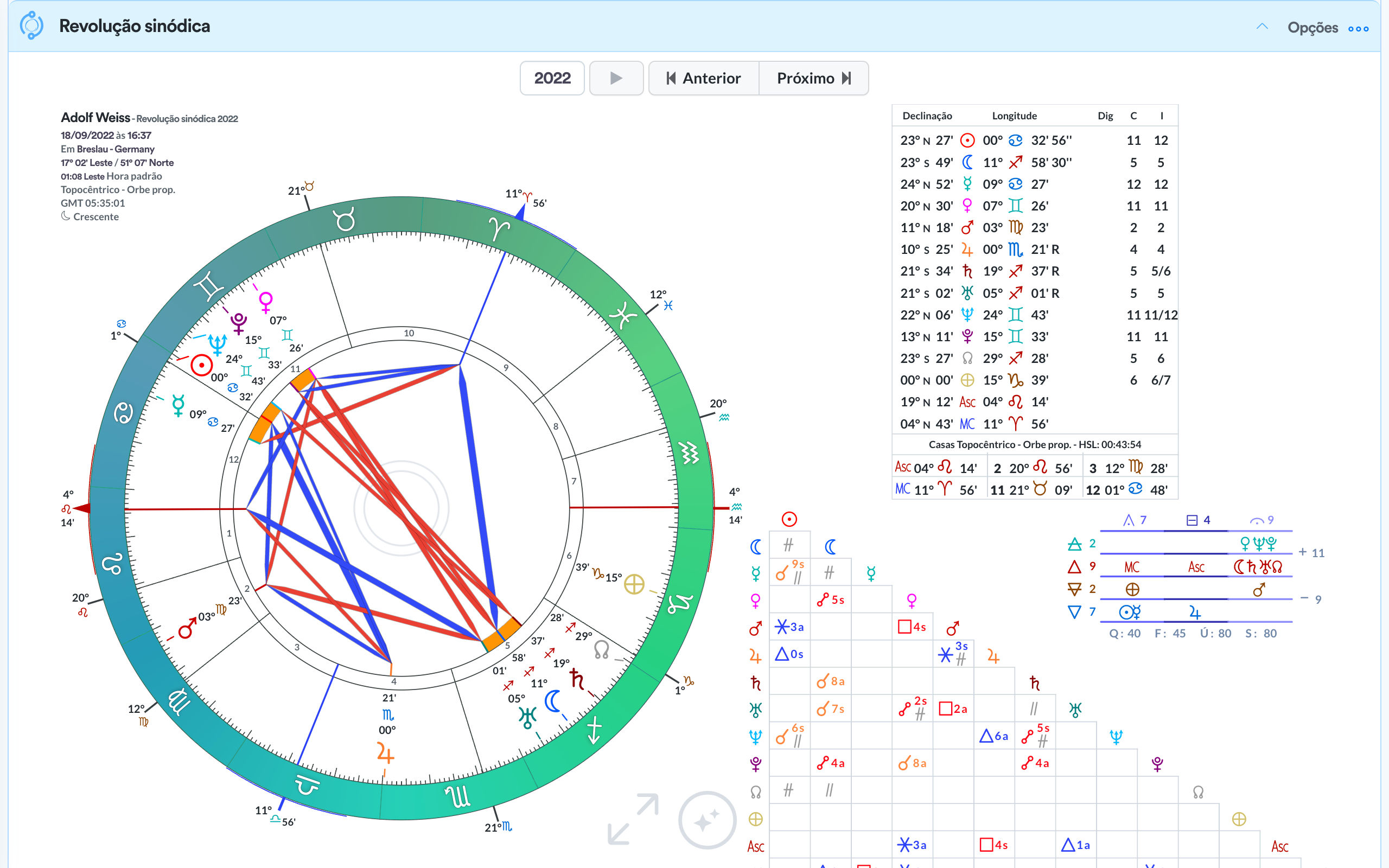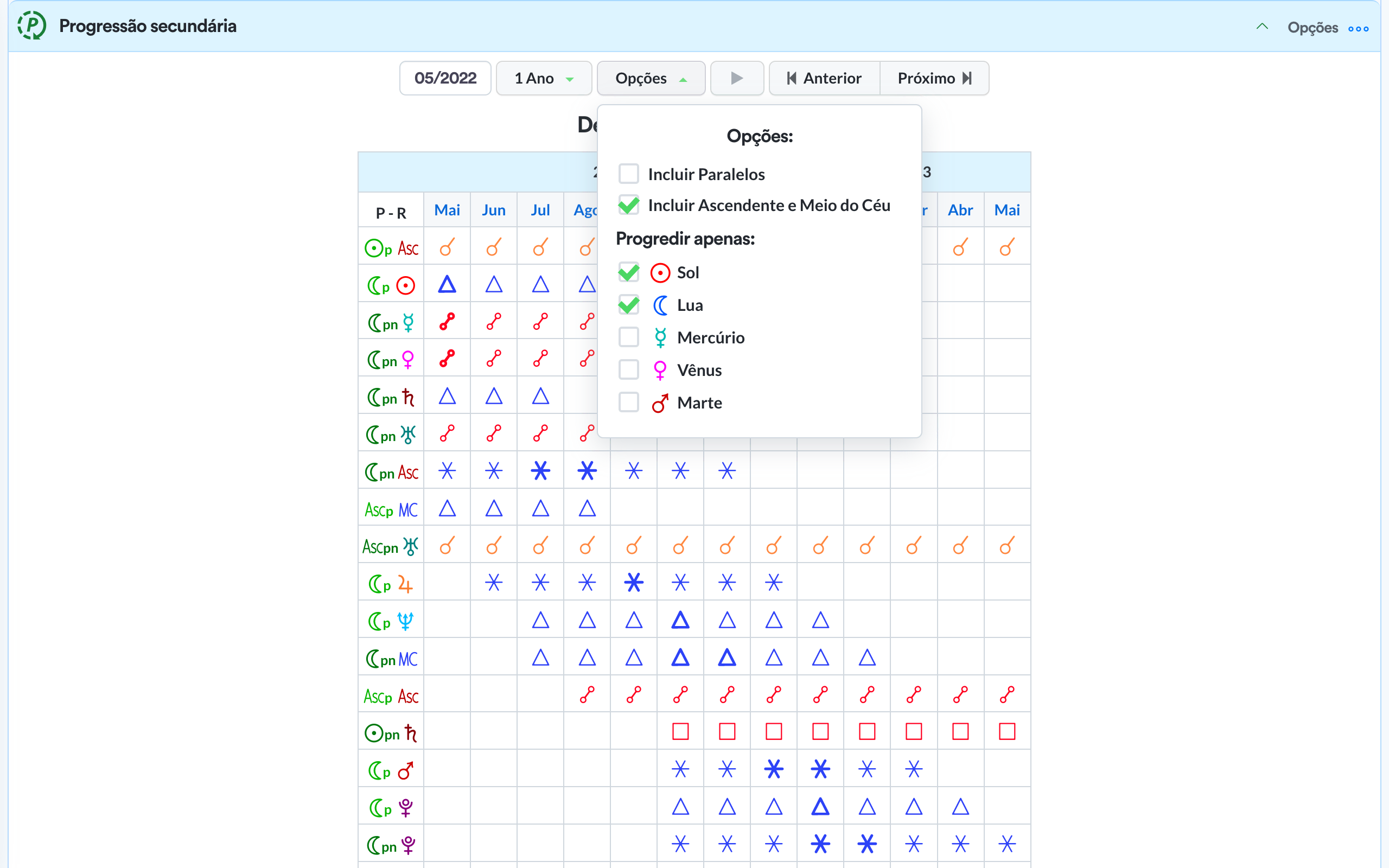 - Quadro de ângulos / aspectos.
