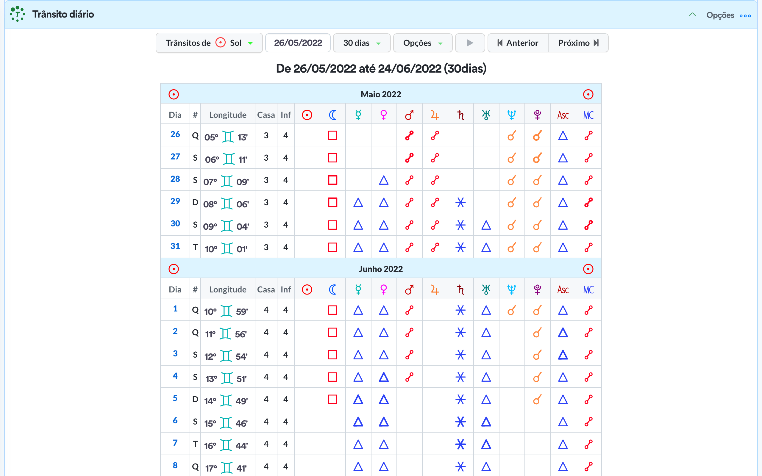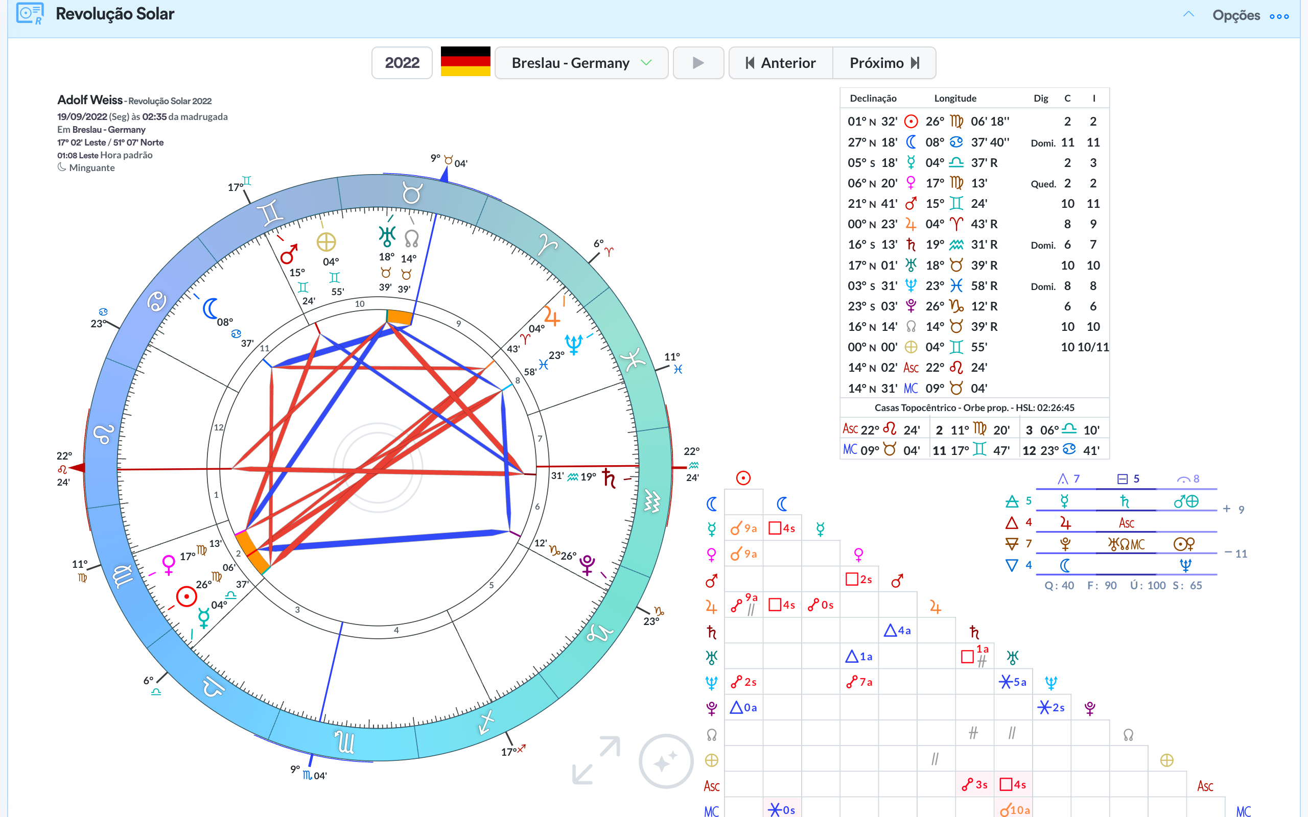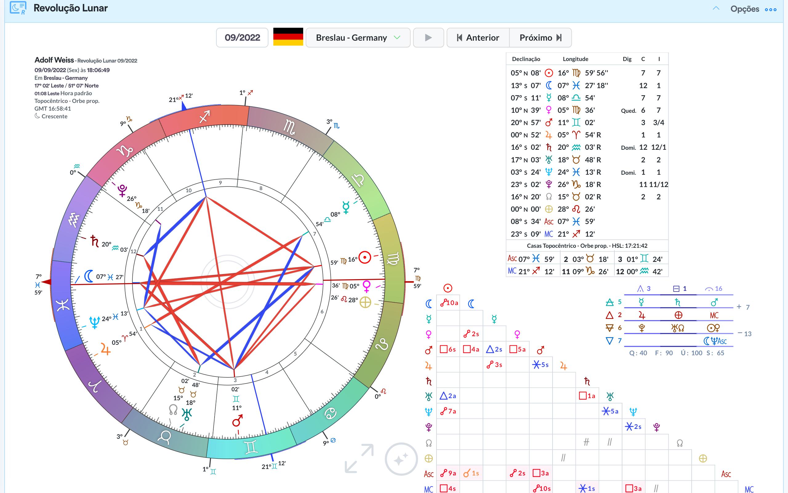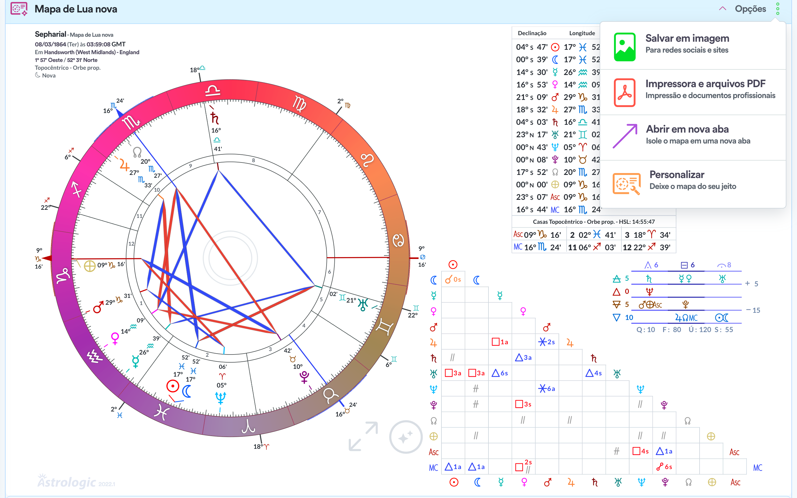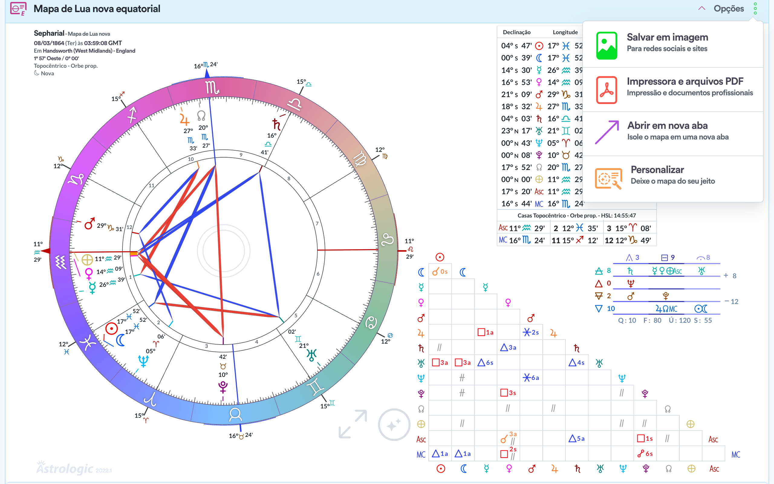 - Quadro de ângulos / aspectos.