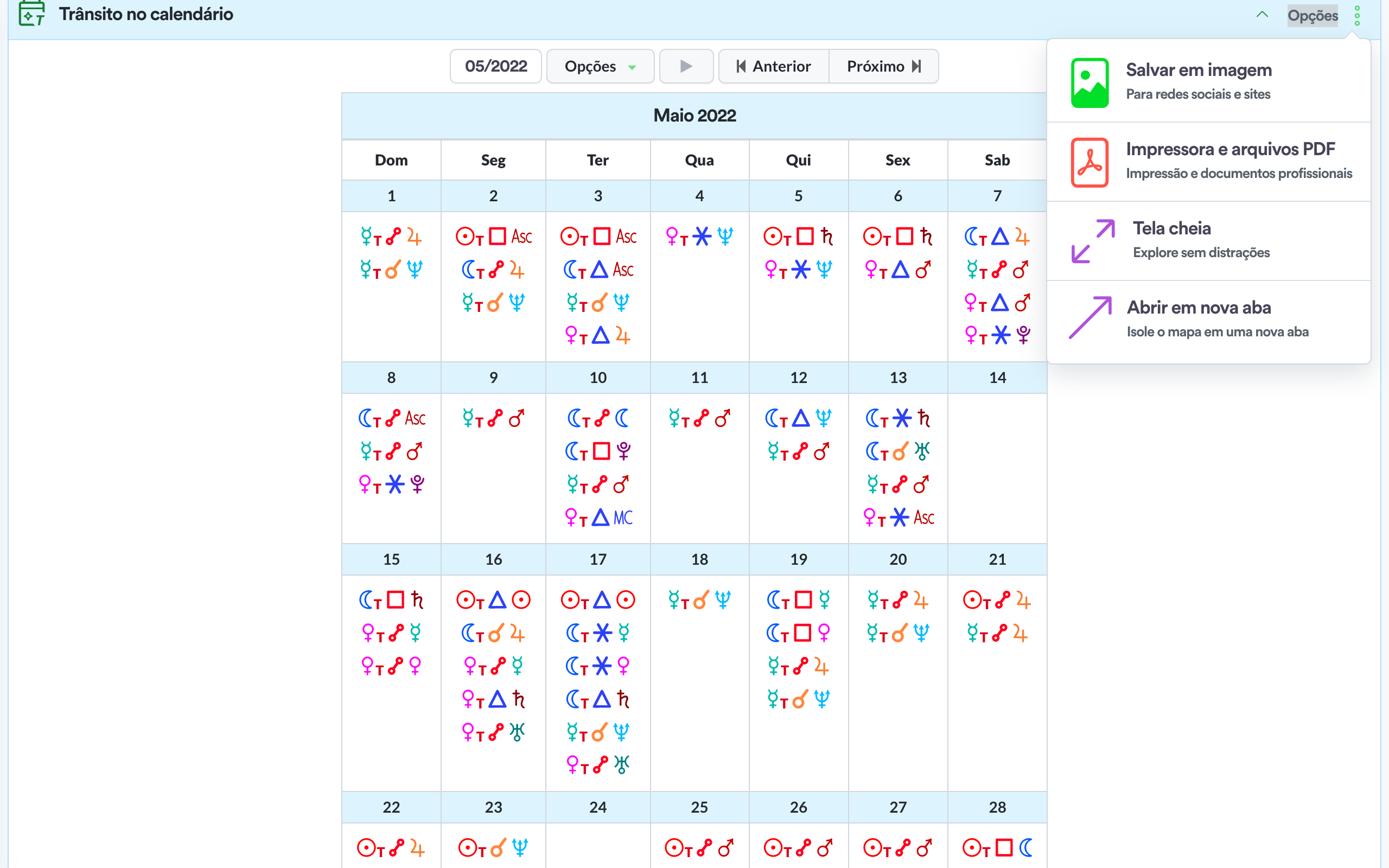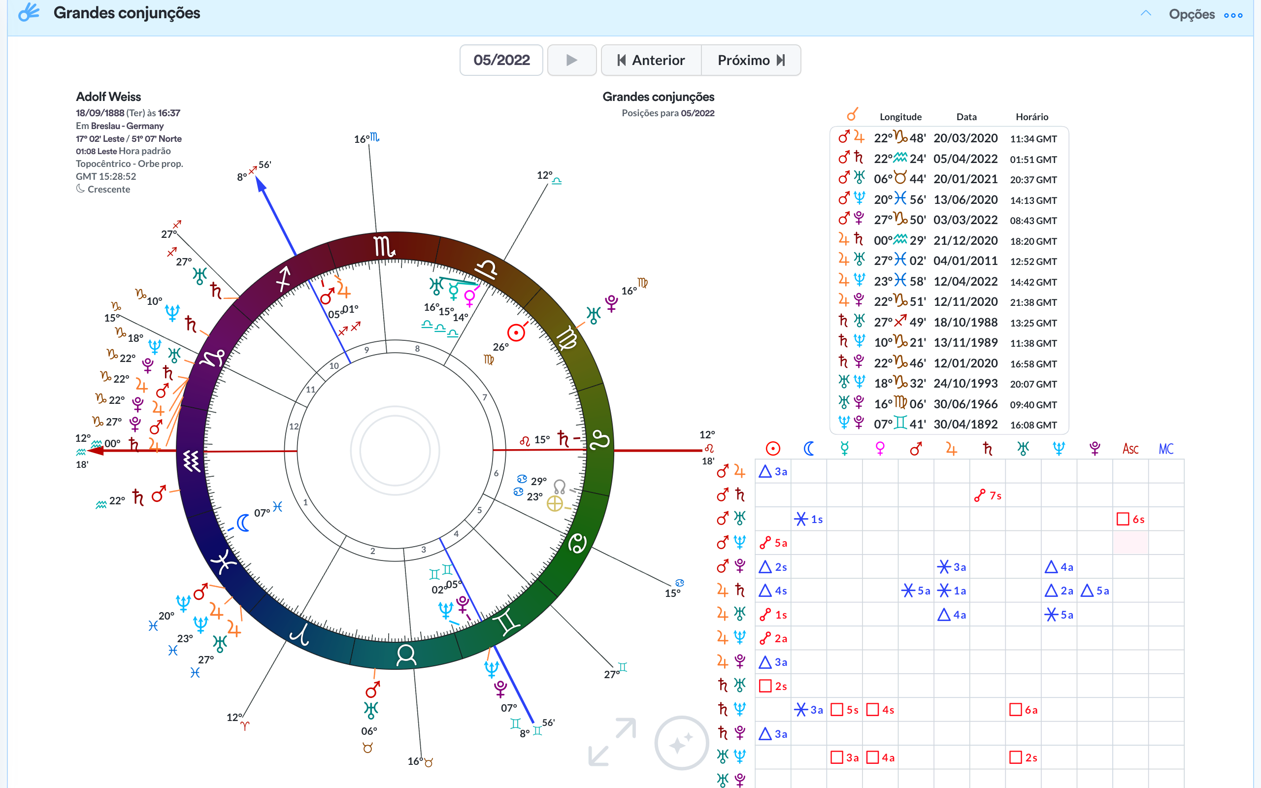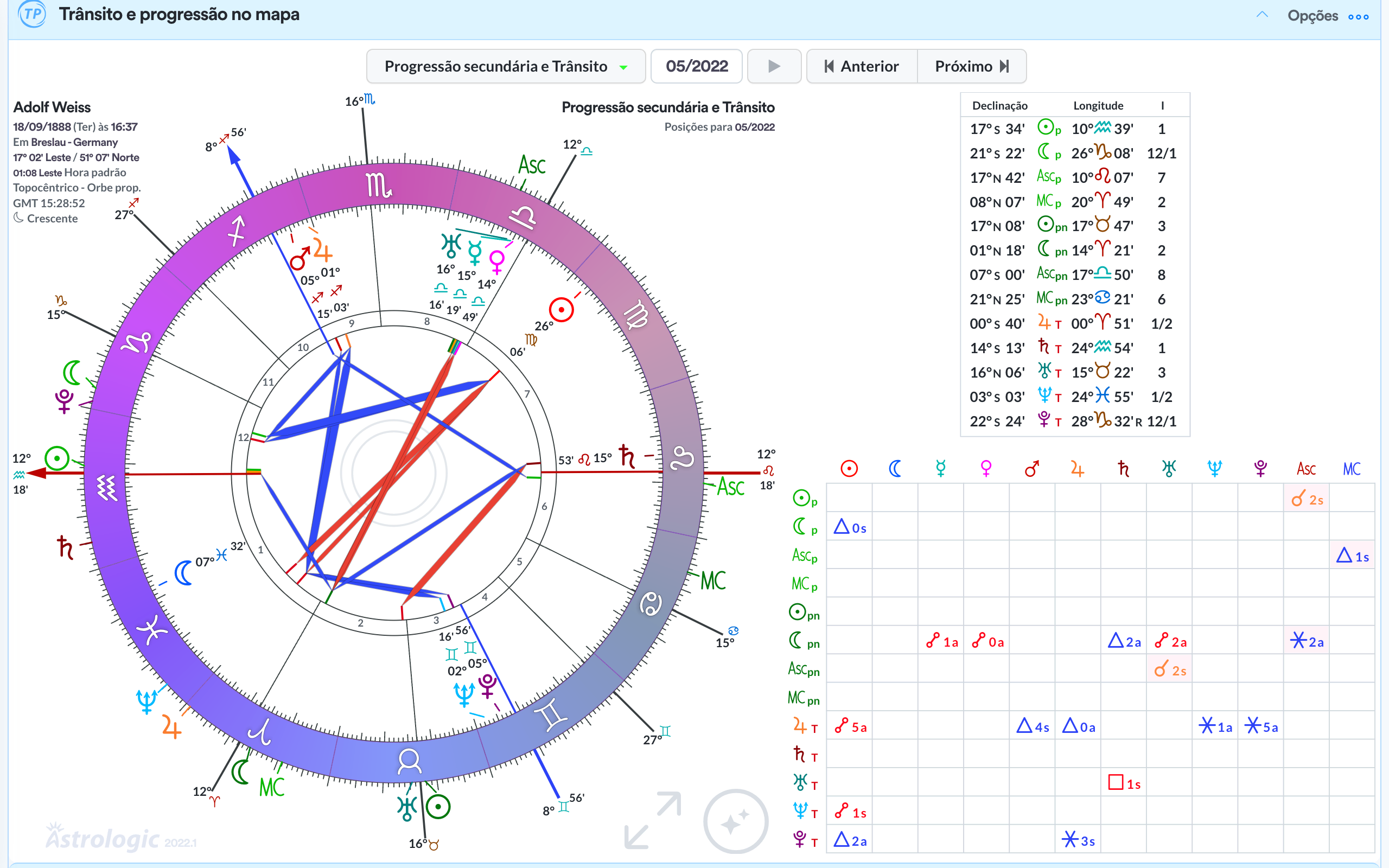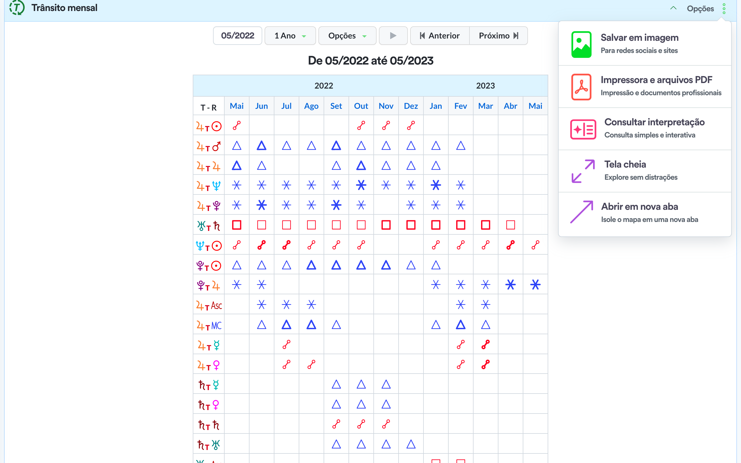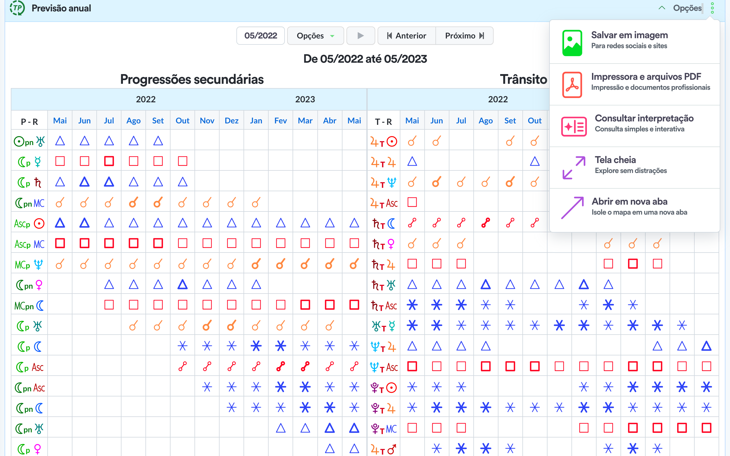 O melhor quadro de previsão por ciclo, apresenta os trânsitos lentos e significativos de um lado, assim como progressões secundárias em linha de tempo no outro oferecendo o melhor dos mundos.